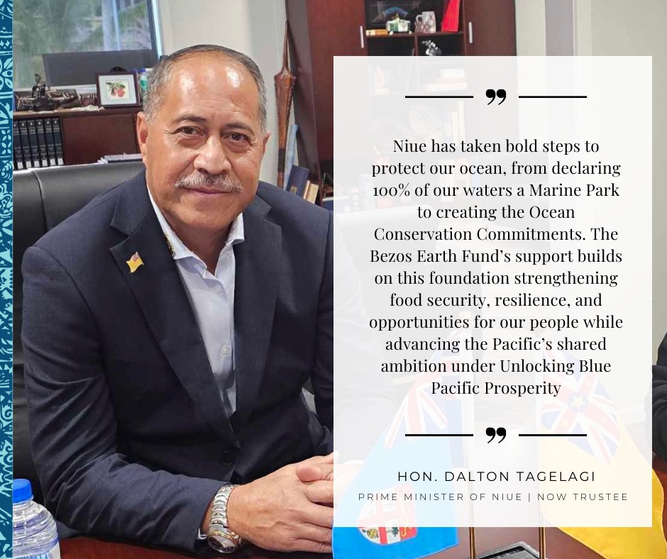 Alofi, Niue (15th September , 2025) A US$4 million investment from the Bezos Earth Fund will support the permanent protection and sustainable management of Niue’s ocean through the Niue Ocean Wide Trust – a sustainable finance mechanism – designed to help safeguard Niue’s marine environment, ecosystems, and support long-term, community-led ocean protection.